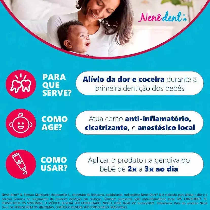 Com sabor suave e aplicação local fácil, Nenê Dent é ideal para tornar o processo de dentição mais tranquilo para o bebê e os pais.
